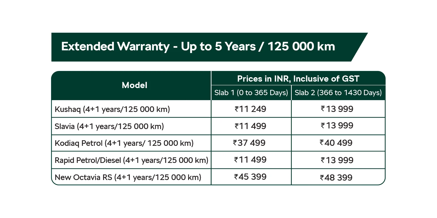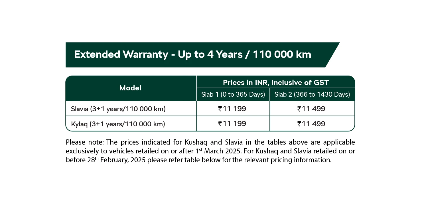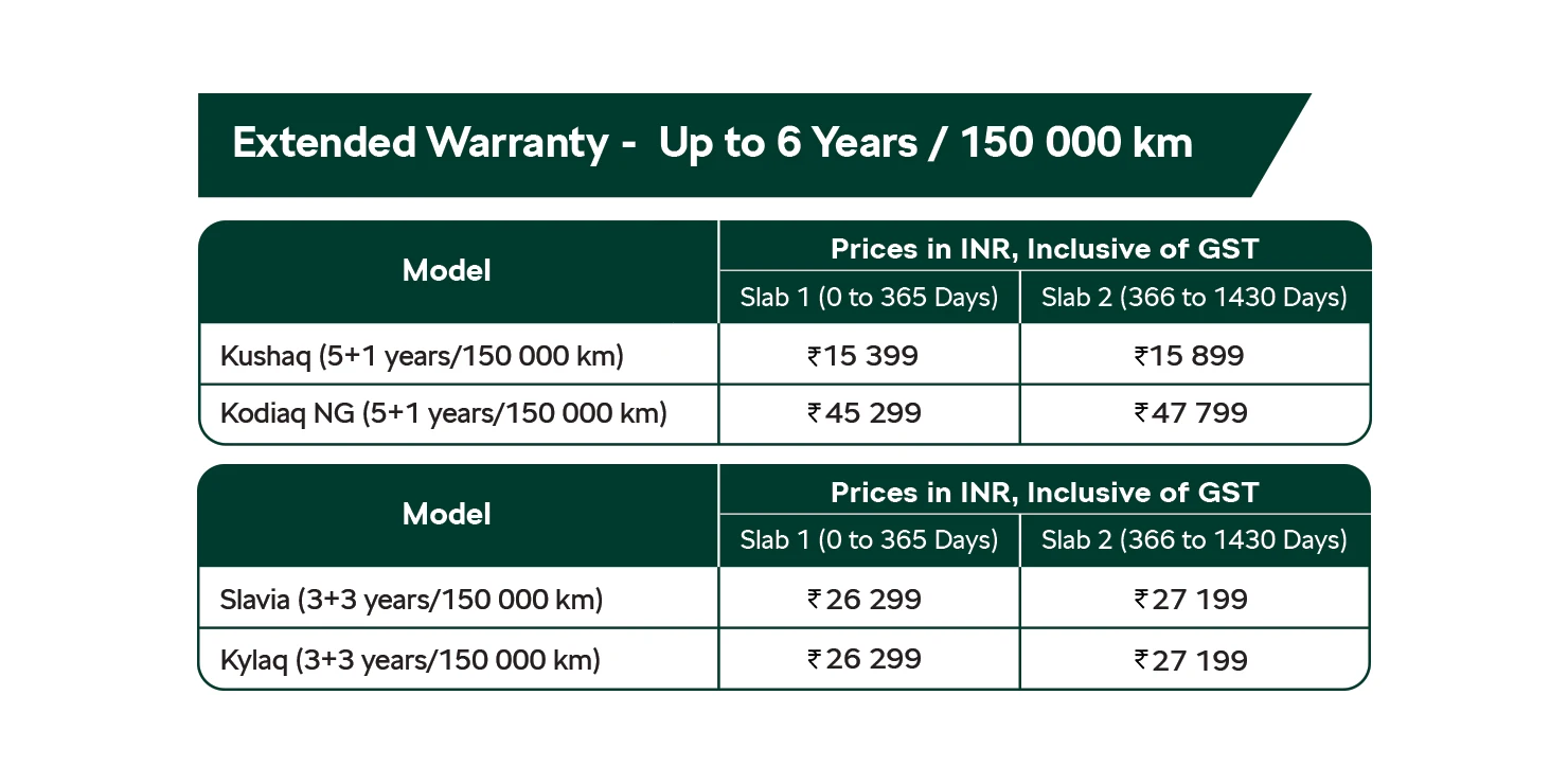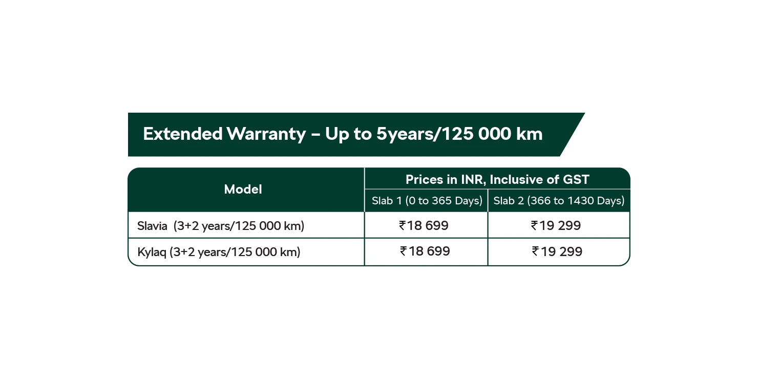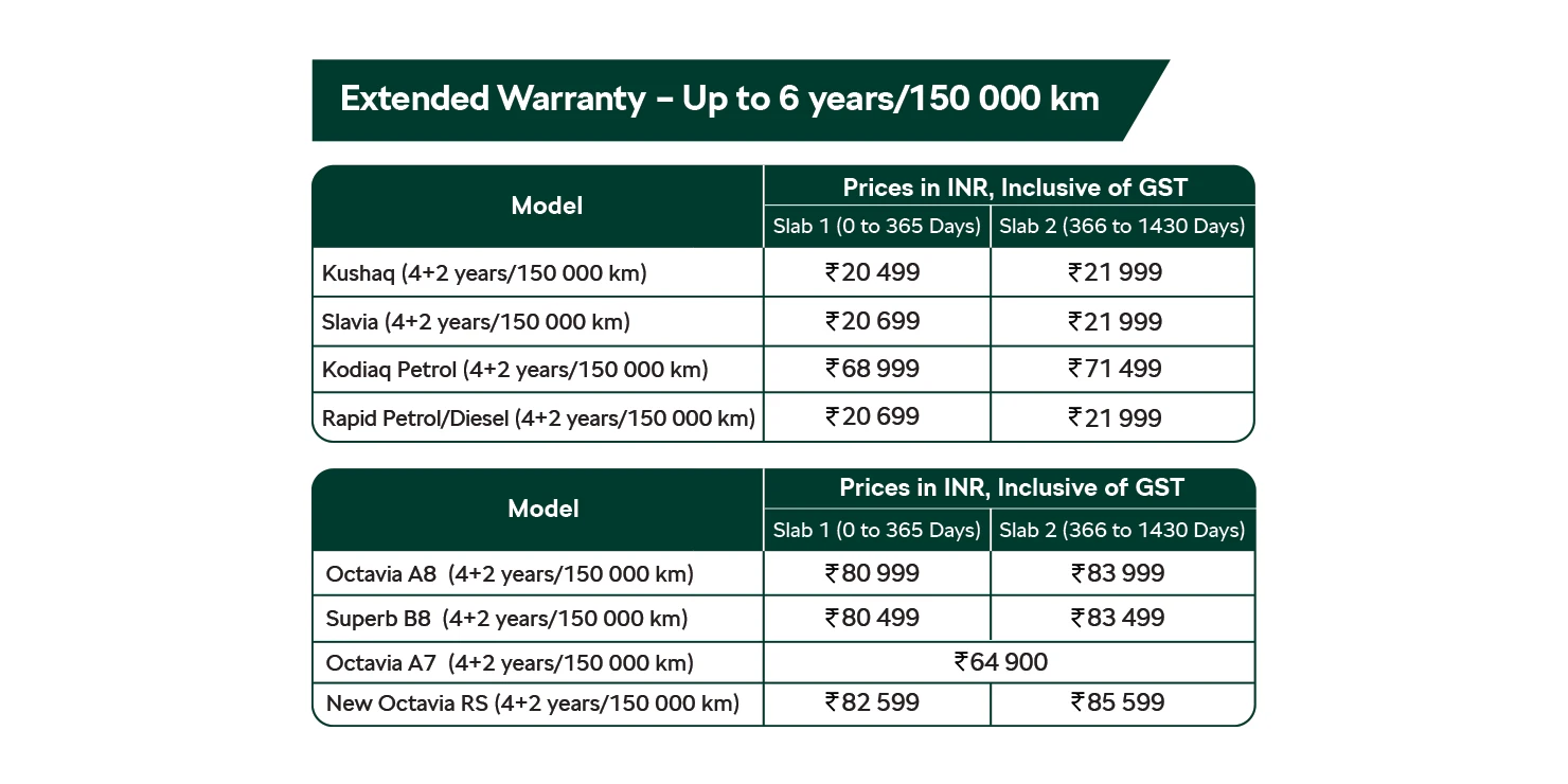 The segment first initiative ensures Up to 6 years or 150 000km (whichever is earlier) of hassle free ownership experience across the Škoda Auto product range from the date of purchase of a Škoda Auto vehicle. With our Extended Warranty, you’re safeguarded from financial stress due to unforeseen breakdowns, ensuring your vehicle stays in top condition for years to come.