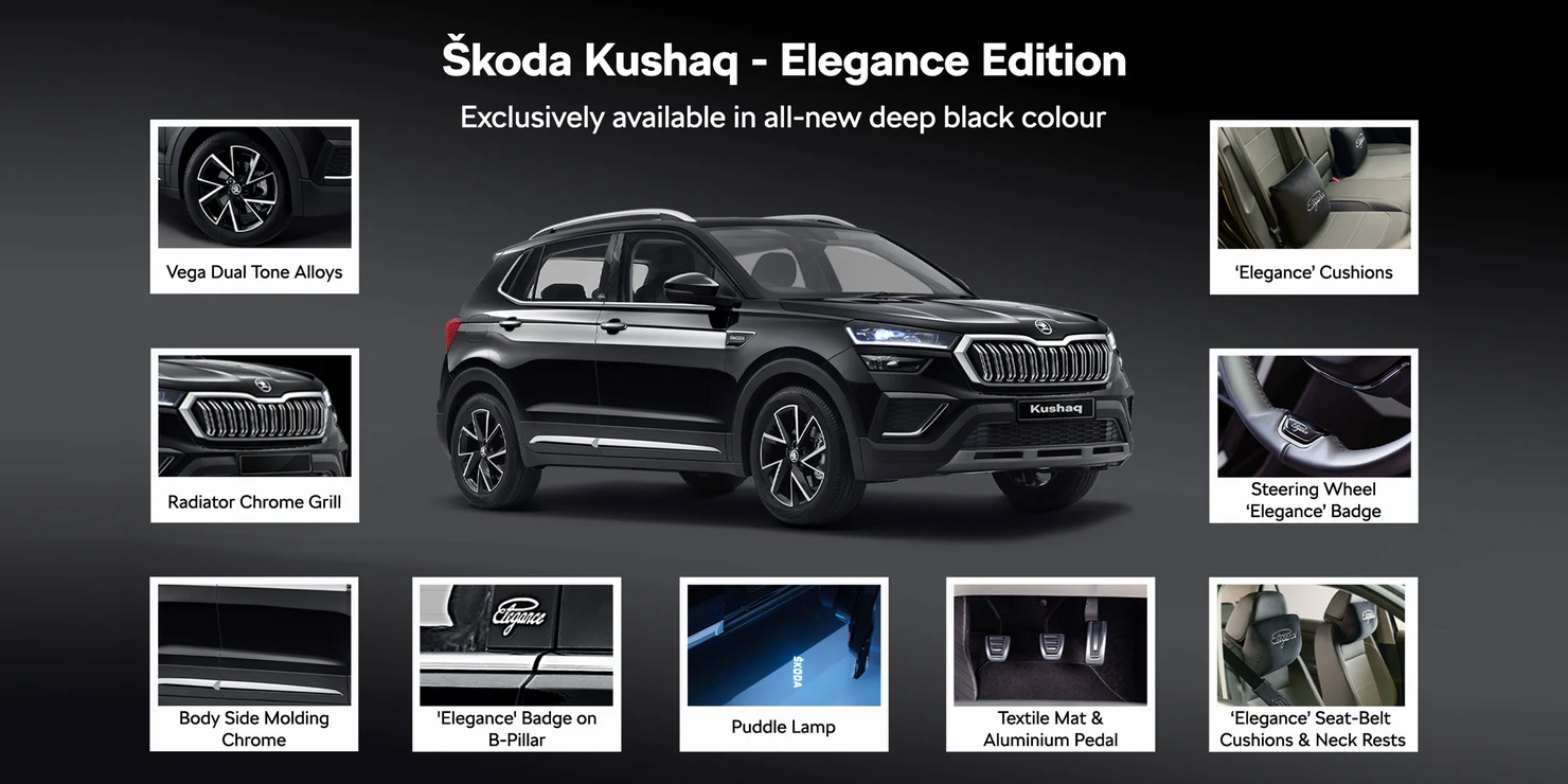 The Elegance Editions of the Kushaq and Slavia will exclusively be powered by the 1.5 TSI turbo-petrol engine. Customers can choose to pair this with a 7-speed DSG automatic or the 6-speed manual. To ensure exclusivity for customers of this special edition, Škoda Auto India will manufacture a limited number of the Kushaq and Slavia Elegance Edition. They will be in the all-new Deep Black paint and are positioned above the fully-equipped, top-of-the-line Style variants.