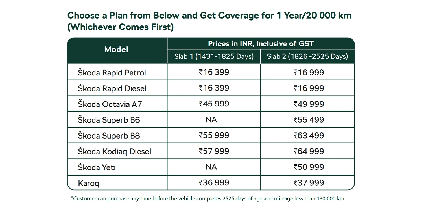 Škoda believes in offering its customers a complete peace of mind ownership experience. That's why we have Anytime Warranty, an additional coverage of 1 year/20 000 km, 100% manufacturer's warranty for existing Škoda vehicles. It allows the possibility of extending the warranty coverage up to 8 years or 1 50 000* km.